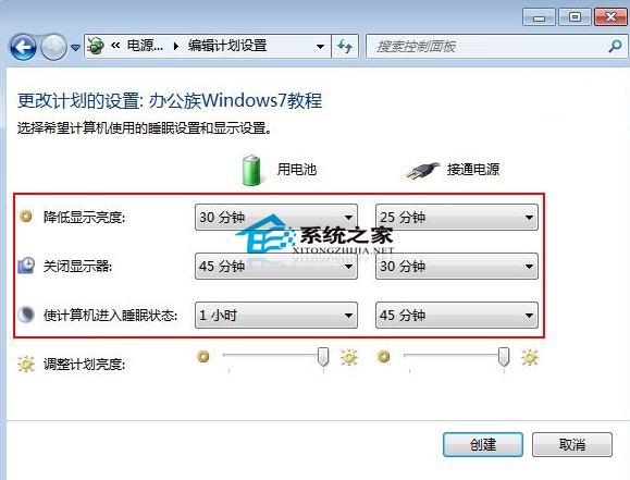 4、之后正在弹没去的界里外,用户能够依据本人的运用习气配置“低落显现明”、“封闭显现器”、“使计较机入进睡眠形态”的工夫,完成之后点击“创立”按钮便可。