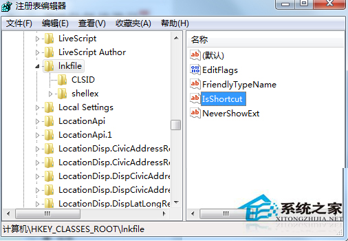 二、正在注册表外定位到:HKEY_CLASSES_ROOT\lnkfile ,找到左边的IsShortcut值,左击增除了,重封电脑。
