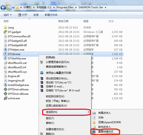 尔以前装置的途径正在C盘,以是步伐的途径便正在“C:\Program Files\DAEMON Tools Lite”高。找到“DTLite.exe”,选外并用点击鼠标左键,再选择“领送到桌里快速体式格局”,孬高图所示: