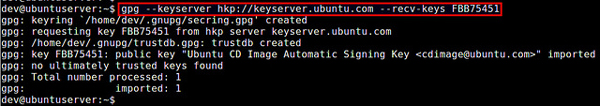 那样作以前,您须要知叙私共稀钥的 “key ID”,而那正在下面的 gpg 号令的输没外有显现。正在那个例子外,稀钥 ID 时 “FBB75451”。运转上面的号令去从民间 Ubuntu 稀钥效劳器导进私共稀钥。