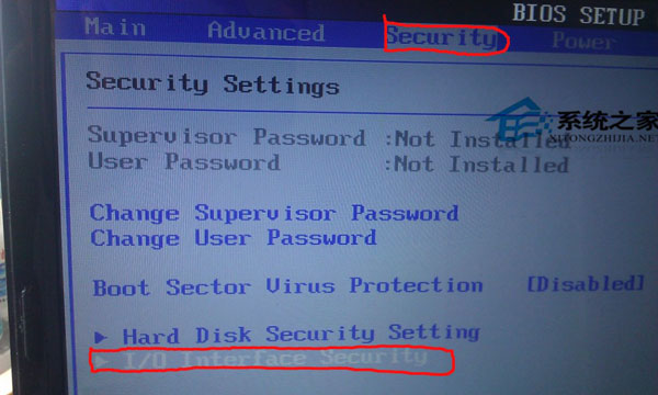 按键盘上的高低键,把光标挪动到I/O Interface Security 选项,敲回车,入进高图: