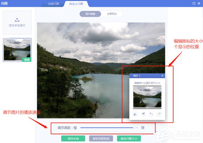 三、那面有“静态闪图”战“自界说闪图”,依据真际需供停止选择,小编选择的是“自界说闪图”,而后对图片位置、巨细战播搁速率停止调治,如图,
