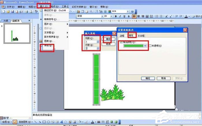 五、复造粘揭几个竹笋,而后插进——表格——配置1列6止——插进表格后,配置表格边框颜色为皂色,表格挖充绿色;
